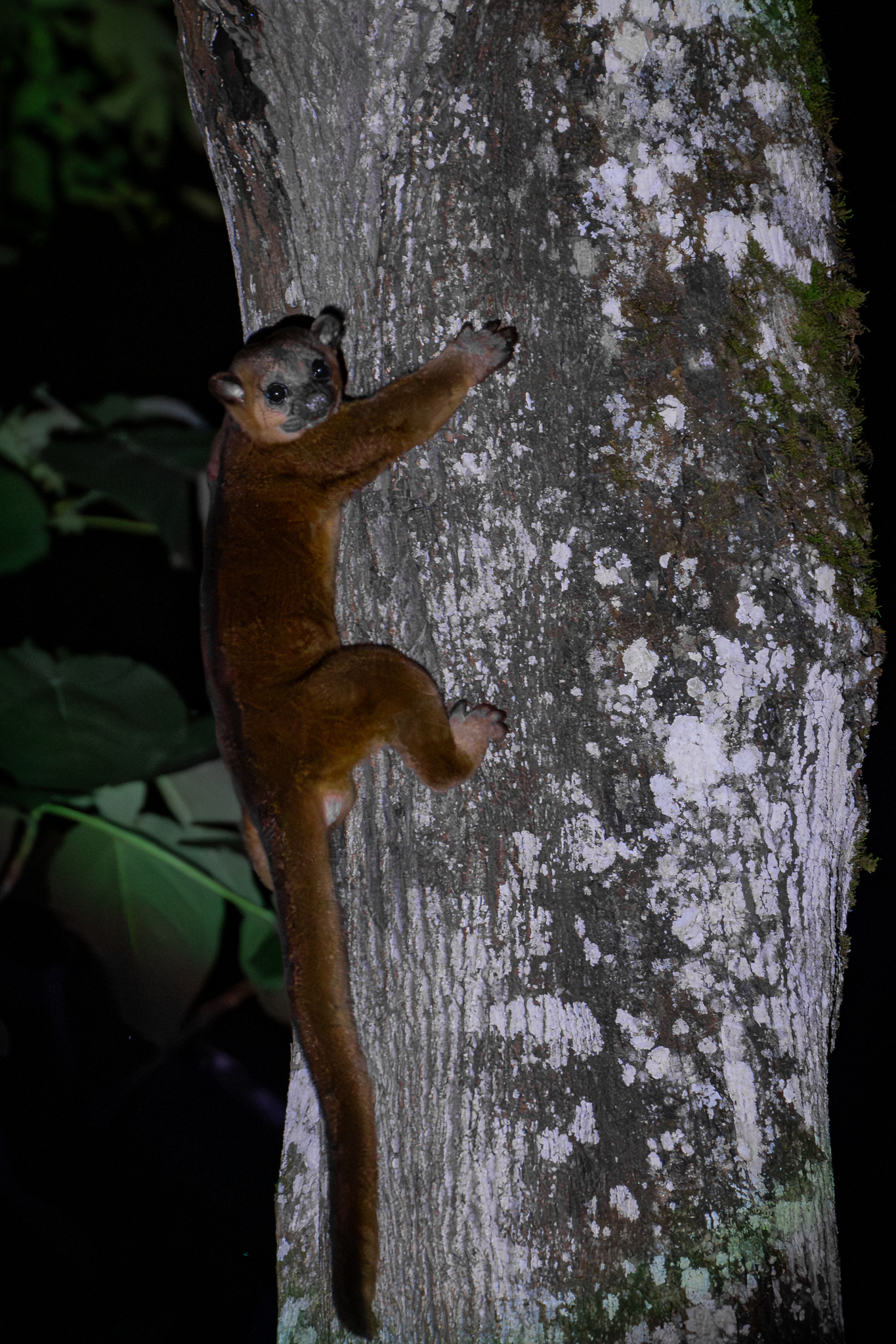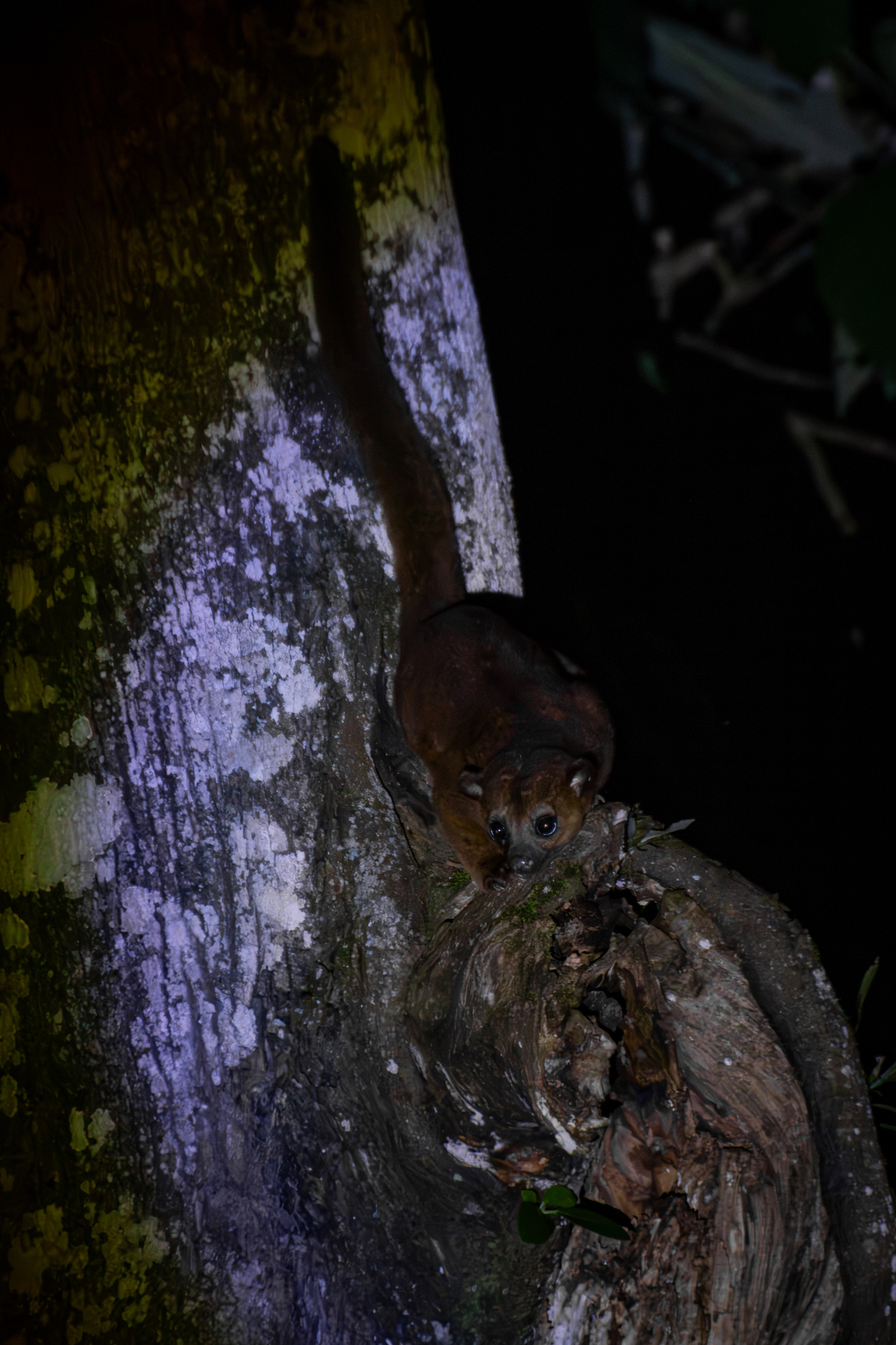 On the second day, we started early by visiting the feeding station for the Blue-lored Antbird, where we were lucky enough to spot up to four different individuals moving through the vegetation. We also managed to see a shy Moustached Antpitta, one of those special sightings that make any birding day memorable. After breakfast, we set off once again along the reserve’s trails, as always with the help of the local guides included in the stay, whose expertise proved invaluable in spotting species we might otherwise have missed. One of the highlights was the observation of a striking Golden-collared Manakin. As night fell, the activity continued: we were able to see a magnificent Spectacled Owl in action. The day’s grand finale came with several Kinkajous emerging from a cavity they use as a daytime shelter, giving us a truly unforgettable moment.